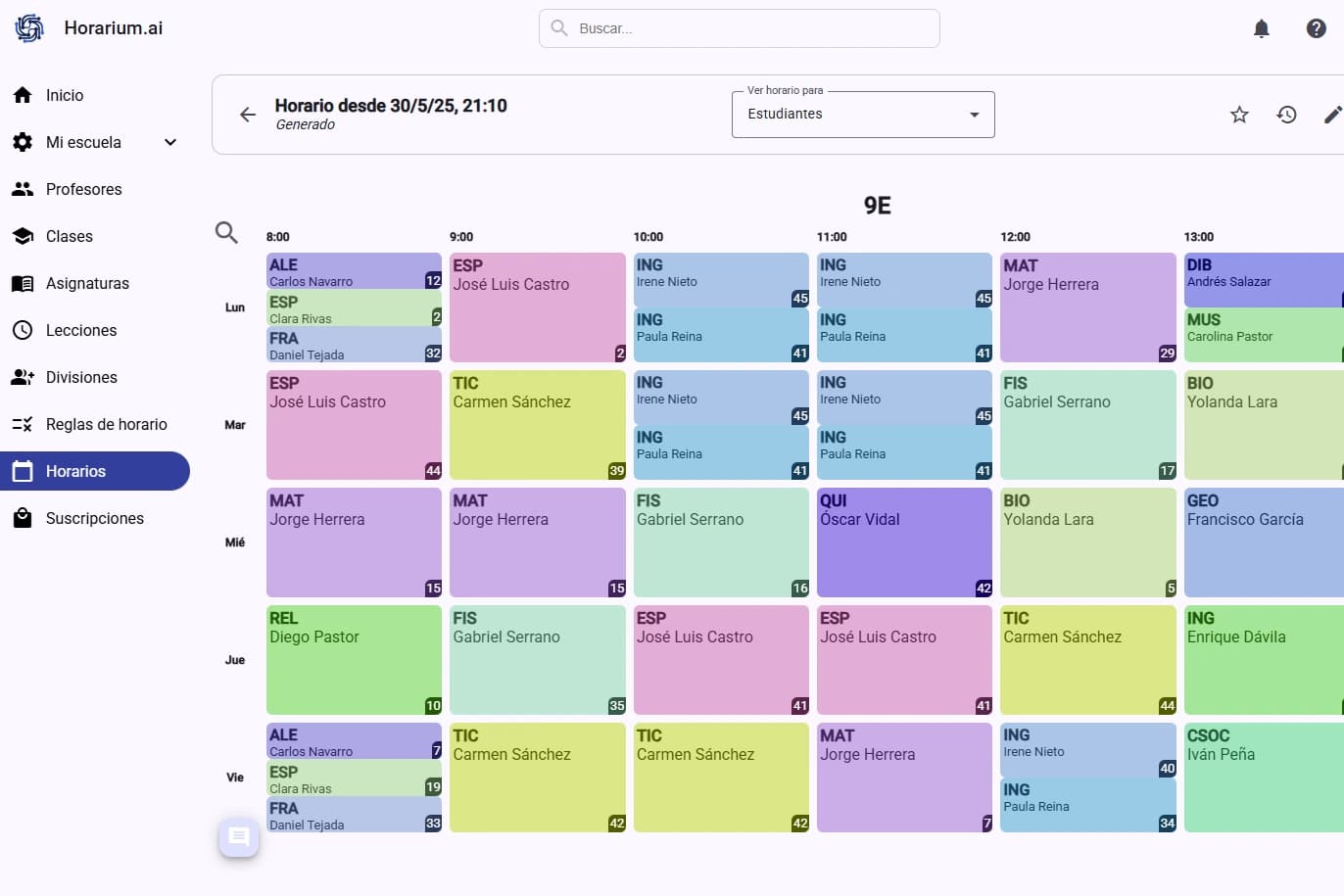El tiempo de generación varía según la complejidad de los datos, pero generalmente tarda menos de 5 minutos en obtener un buen resultado. Nuestros algoritmos inteligentes evalúan más de 10.000 versiones por segundo para encontrar el horario óptimo que cumpla con todas las restricciones.