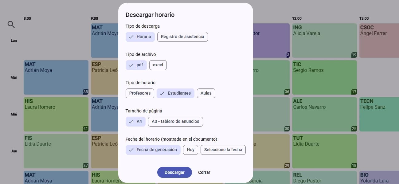 Una vez generado el horario, también recibirá un informe con todas las restricciones que no se han podido cumplir. Si es necesario, puede editar el horario manualmente o volver a generarlo. Finalmente, expórtelo en PDF o Excel.